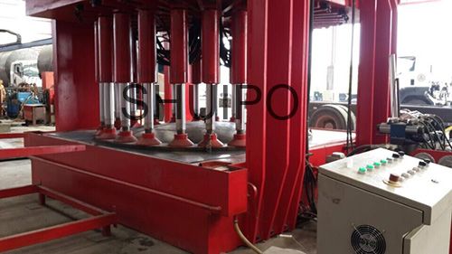 液壓缸采用倒吊的方式安裝在上平臺(tái)上,上平臺(tái)安裝導(dǎo)向條,液壓缸可在導(dǎo)向條內(nèi)自由移動(dòng),以適應(yīng)各種封頭的形狀。液壓系統(tǒng)應(yīng)用比較廣泛,其壓力大、可操作性好,配件比較容易采購。